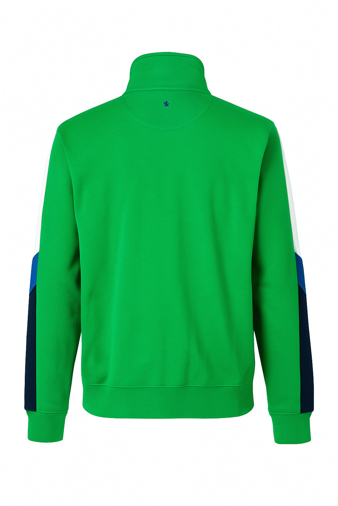 Sporty, chic, and bold. The Jessa Funnel Neck Zip-Up is a modern take on retro sports styling. Designed in a fresh Sporty Green, it’s elevated with diagonal side panels in Cloud Dancer, Electric Blue, and Dress Blue, nodding to classic 70s and 80s track jackets.